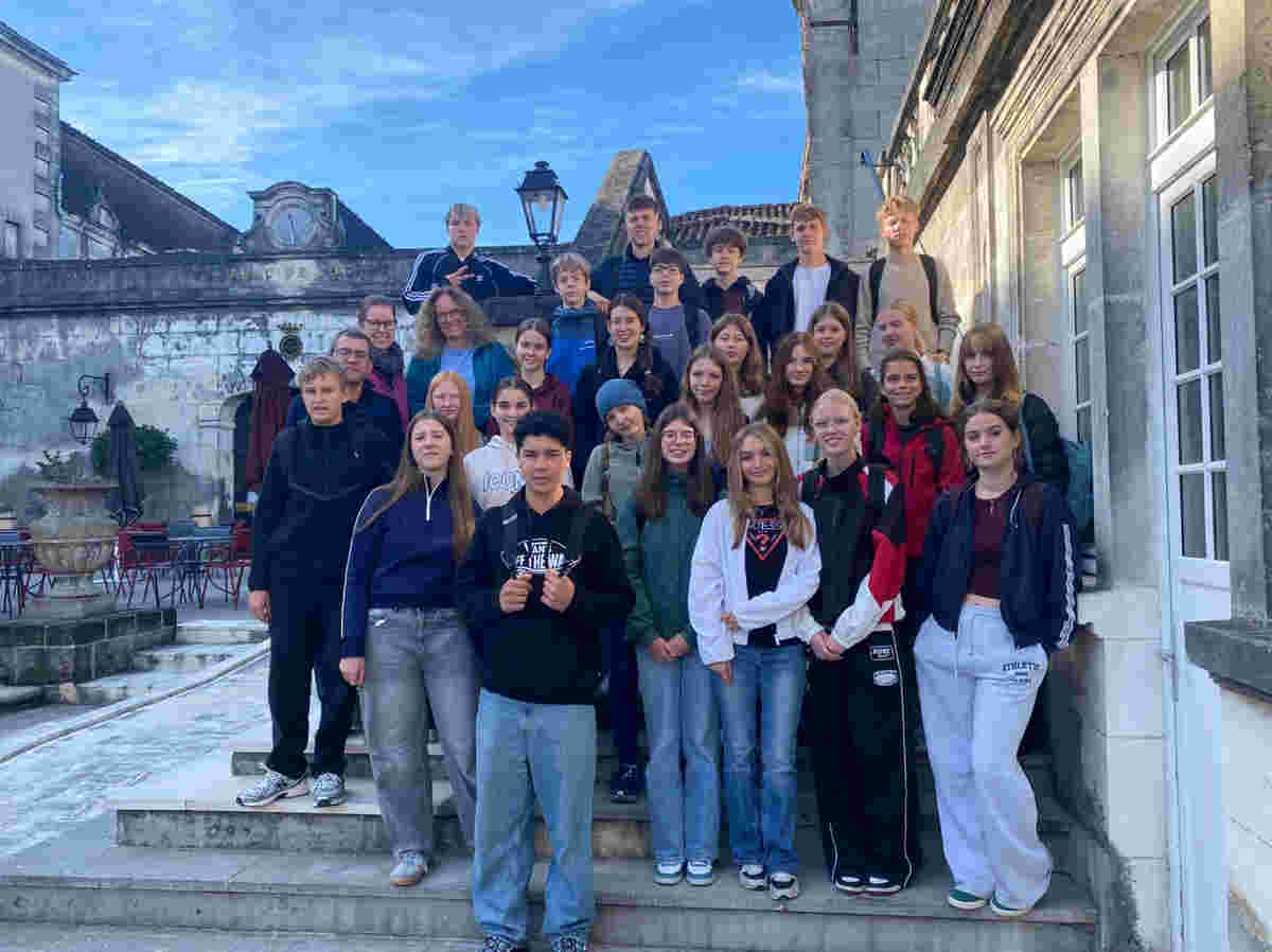 Nach einjähriger Pause fand vom 1. – 9. Oktober 2025 endlich wieder der Schüleraustausch mit Cognac statt! In Begleitung von Frau Breithaupt, Frau Thalau und Herrn Huneke machten sich 25 Schüler*innen der 9. und 10. Klassen unseres Gymnasiums auf Entdeckungsreise in unsere Partnerstadt in der Charente. Während des Austausches waren sie bei ihren corres untergebracht und nahmen so am französischen Familienalltag teil.Neben gemeinsamen sportlichen und sprachgebundenen Aktivitäten standen natürlich auch die Erkundung von Cognac und der näheren Umgebung auf dem Besuchsprogramm. Mit ihren corres unternahmen die Schüler*innen einen Tagesausflug nach La Rochelle am Atlantik und lernten auch die damalige Hauptstadt der römischen Provinz Aquitanien, Saintes, im Rahmen einer Stadtrallye kennen. Im Château François Ier in Cognac erhielten sie einen interessanten Einblick in die Geschichte der Stadt und der Cognacproduktion. Bei bestem frühherbstlichem Wetter unternahmen die Schüler*innen am Wochenende mit ihren Gastfamilien Ausflüge in die Region, die sie u.a. nach Royan an der Gironde führten, aber auch gemeinsames Bowling oder Kartfahren in Cognac erfreuten sich großer Beliebtheit. Unser besonderer Dank gilt dem Partnerschaftsverein Königswinter, der das Besuchsprogramm finanziell tatkräftig unterstützte. Unsere Schüler*innen kehrten mit vielen positiven Eindrücken aus Cognac zurück und alle freuen sich schon auf den Empfang ihrer corres vom Collège Félix Gaillard und Collège Beauregard im April 2026!