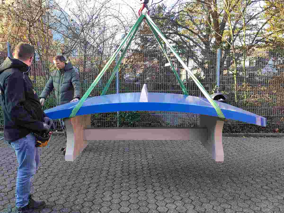 Am Montag, den 15.12.2025, war es so weit: Das lang erwartete Weihnachtsgeschenk des Fördervereins unserer Schule, eine Teqball-Platte, wurde angeliefert. Kurz darauf schwebte sie vom LKW herab und steht nun zur großen Freude auf dem unteren Schulhof. Dort wurde sie schon in der nächsten großen Pause von vielen Spielinteressierten eingeweiht und erfreut sich seitdem größter Beliebtheit. Vielen Dank an das Christkind für dieses blau-weiße Geschenk!