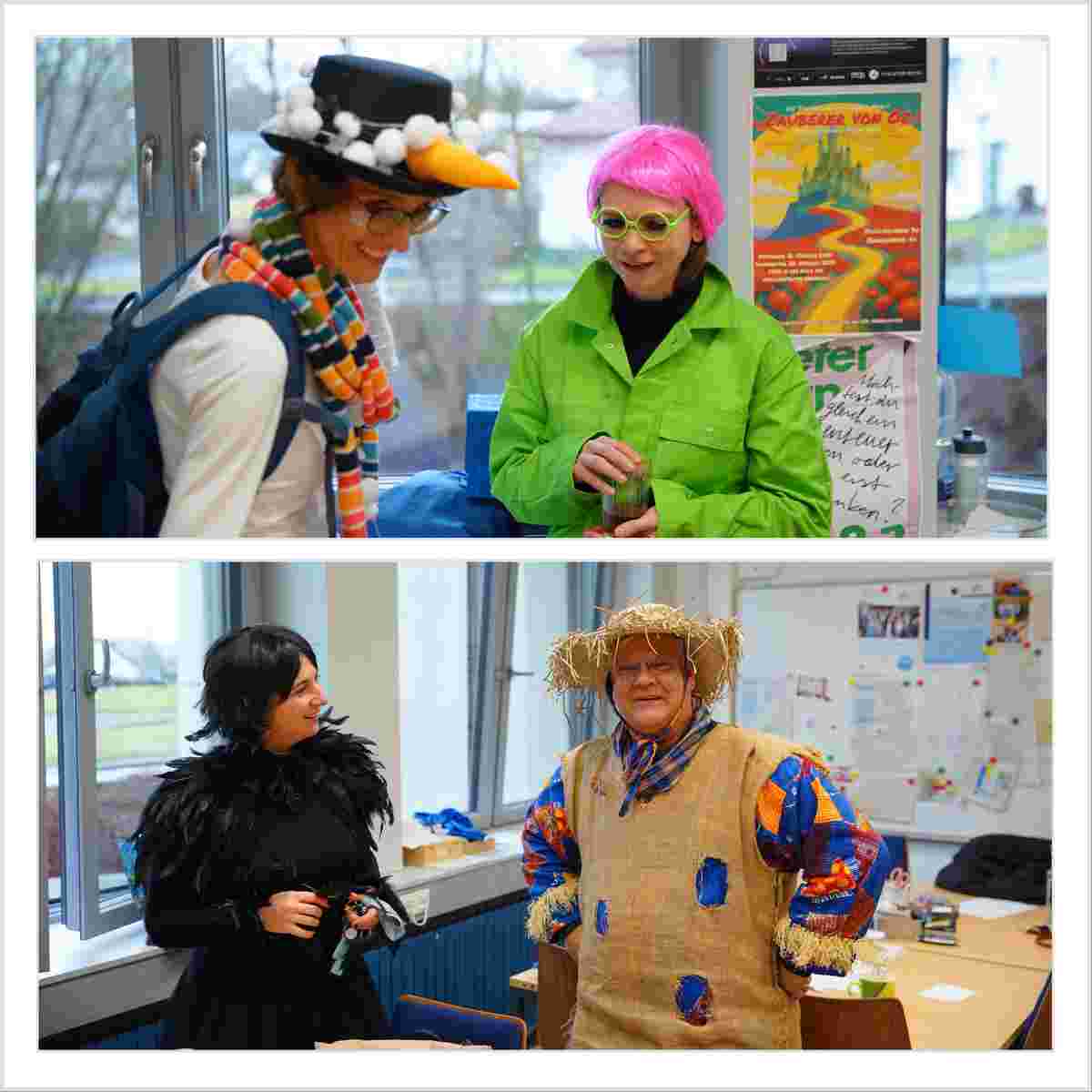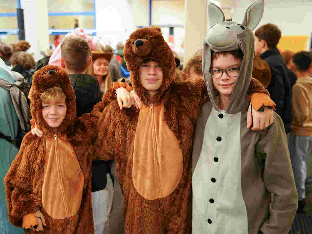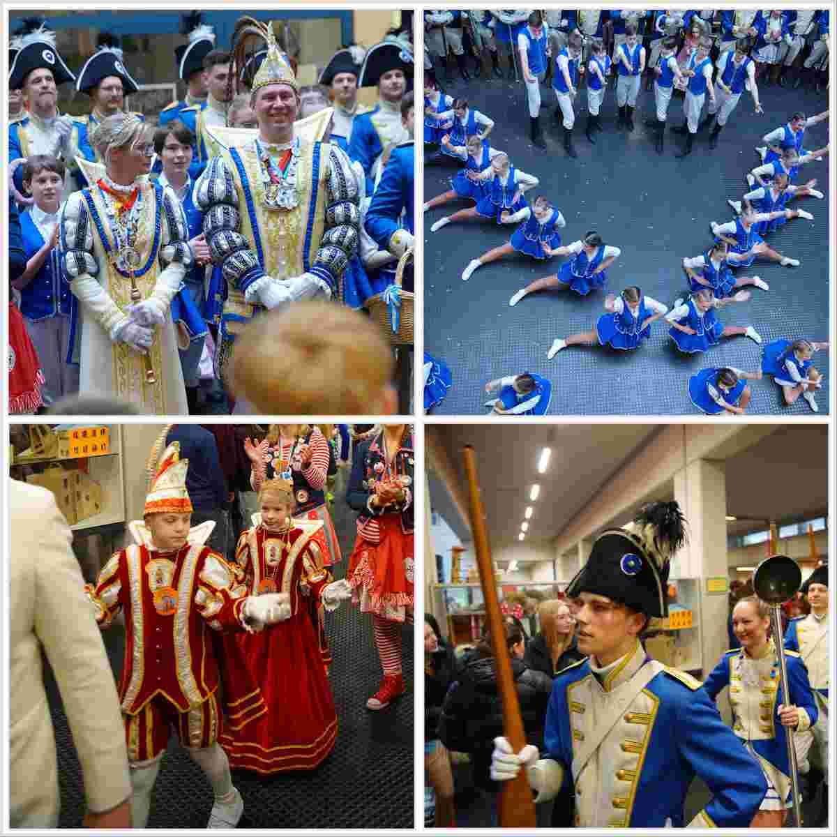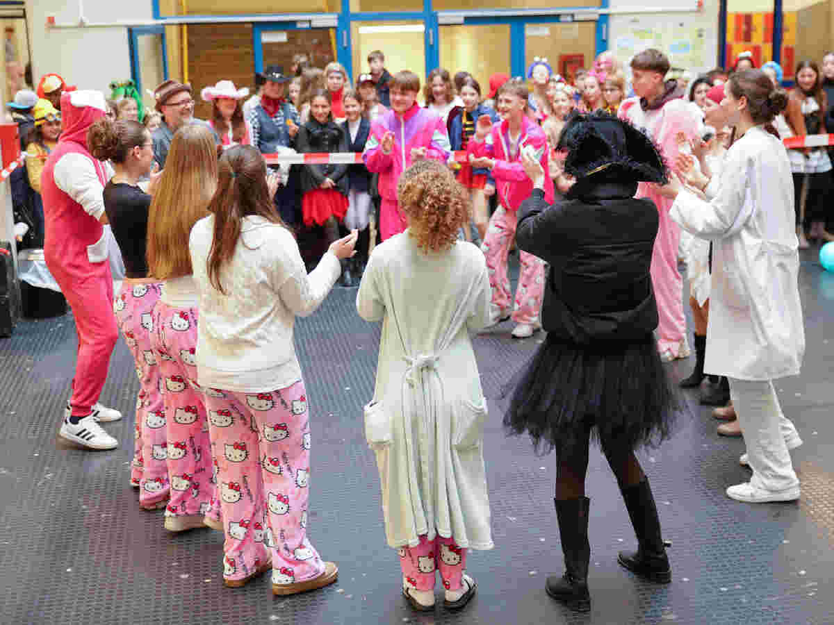 Altweiber am Gao: Ausnahmezustand. Unterricht Fehlanzeige. „Wackelkontakt“, Party und fröhliches Futtern in jedem Klassenraum und mittendrin im bunten Gewühl, in der Pausenhalle, begeisternde Auftritte. Sogar das Oberpleiser Prinzenpaar mit dem Kinderprinzenpaar und dem kompletten Hofstaat beehrte uns mit einem Besuch und wir verfolgten von der Galerie aus, wie man bei den Tanznummern der Bockerother Sternschnuppen und der Dilledöppchen gekonnt durch die Luft fliegt, ohne an der Decke hängen zu bleiben. Wir danken allen Aktiven und den uns tatkräftig bei der Vorbereitung unterstützenden Eltern mit einem donnernden „Plees Alaaf!“